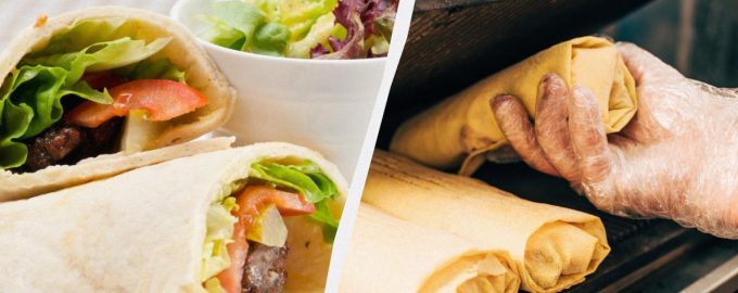 Zdaj pripravimo kebab v piti. Pito narežemo na kose, velike kot dve dlani. Na vsako pito damo žlico čebule in zelišč, nanjo položimo kebab in ga zavijemo.